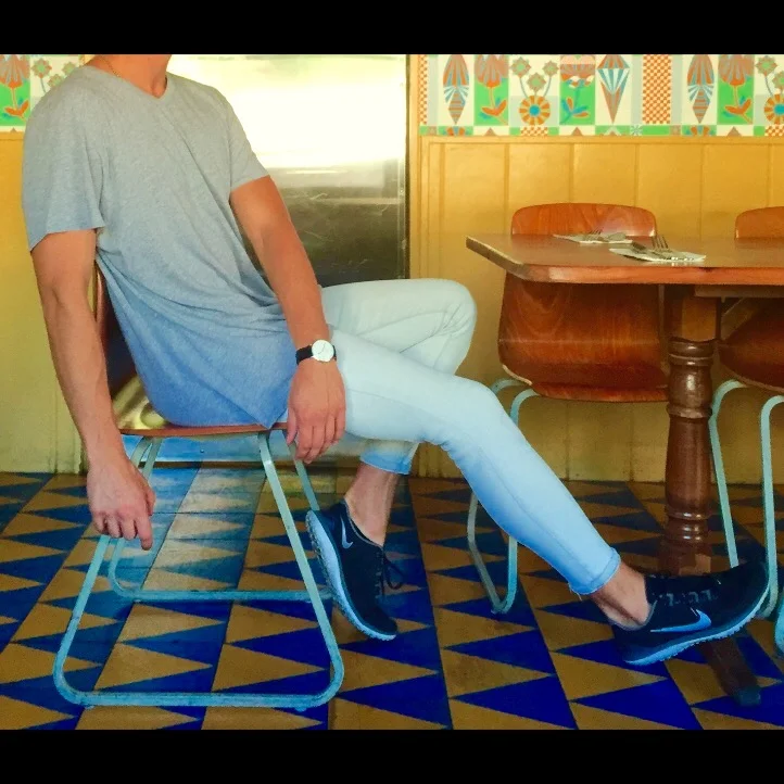 Pants & belt: H&M, Shirt: Forever 21 men, shoes: Nike Zoom Air taken at Beachwood Cafe.